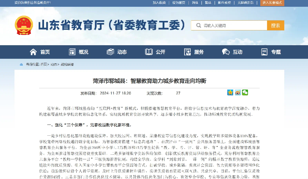 11月27日,山东省教育厅网站“战线联播”专栏以“菏泽市郓城县:智慧教育助力城乡教育走向均衡”为题刊发我县相关经验做法。